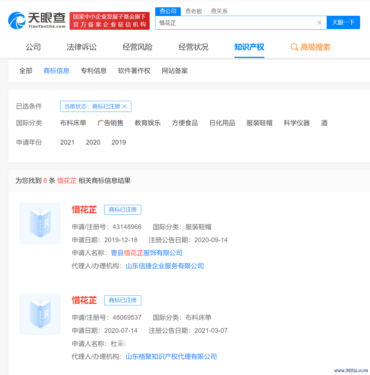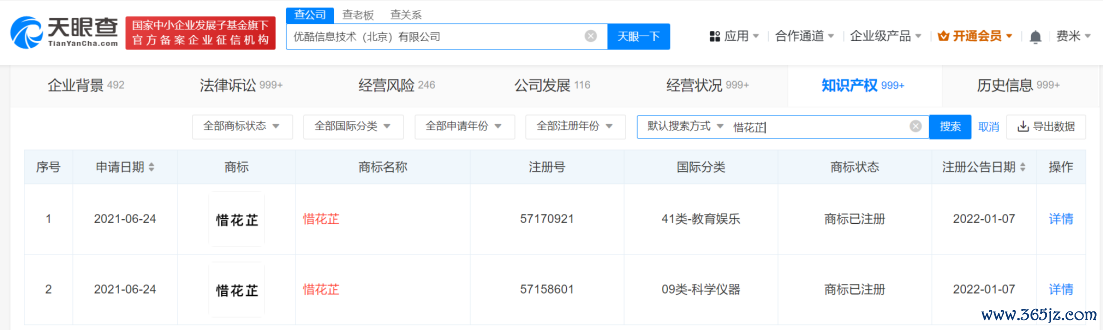 天眼查学问产权信息深切,2021年6月,优酷信息技能(北京)有限公司肯求注册两枚“惜花芷”商标,外洋分类为科学仪器、说明文娱,两枚商标于2022年1月注册告捷。此外,多家公司及当然东谈主曾肯求“惜花芷”商标,外洋分类包括布料床单、服装鞋帽、酒等,其中部分商标已注册告捷。